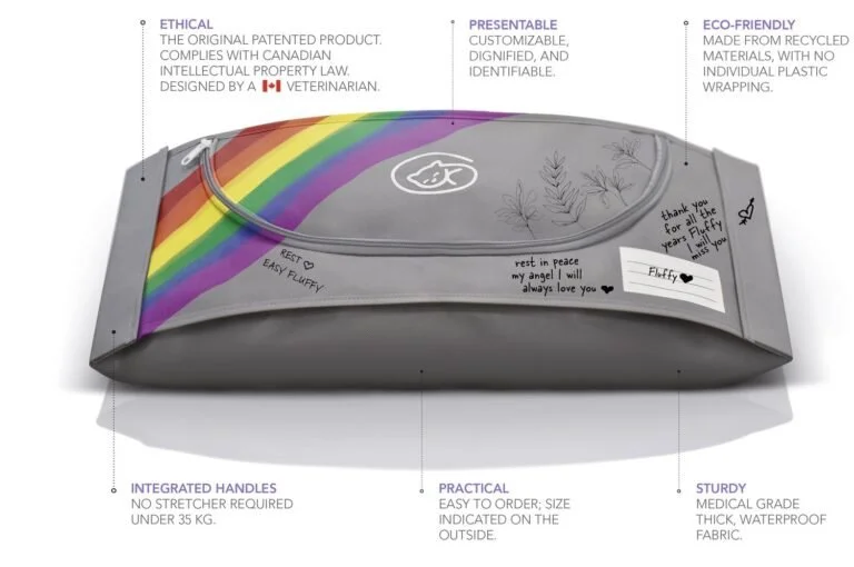 She, therefore, wanted to address these ethical questions by creating EUTHABAG, pet body bags designed in Quebec. They are an affordable and quality alternative that allows owners to end the life of pet companions, who are an essential part of families, in a more respectful and positive way than the process previously put forward. The company aims to improve the experience of euthanasia by providing a body bag that respects the bond between the animal, the family and the veterinary and crematorium teams.